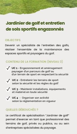Il vise l'acquisition de compétences complémentaires et spécialisées avec une expérience de terrain dans le secteur des métiers du paysage permettant de maintenir la qualité des terrains de jeu.